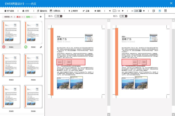 方正云舒书刊制作云平台还采用了添加页面级校对批注,标记每一页文件内容是否正确,针对错误的页面,可以将清样上手写的批注内容通过照相采集的方式反馈给排版公司,也可以直接在系统中备注修改意见或是上传修改素材文件,供排版公司改稿使用。此外,云舒系统也提供电子文件的页面对比、替换等计算机辅助校对功能,利用互联网技术实现图书排版的实时在线校对,从根本上解决了出版社异地排版、异地校对的问题。